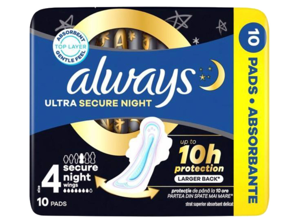 Az Always Ultra Secure Night S4 egészségügyi betét kifejezetten éjszakai használatra lett tervezve, hogy maximális biztonságot és nyugodt alvást biztosítson. Speciális kialakításának köszönhetően akár 10 órás védelmet nyújt, még erősebb vérzés esetén is.