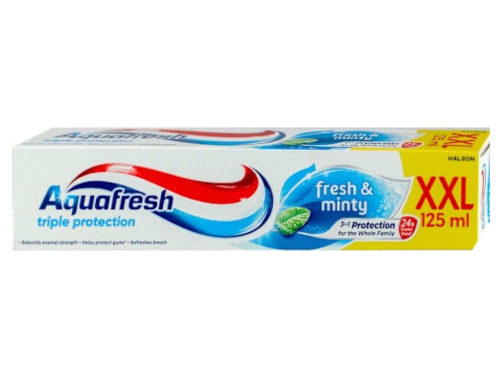 Aquafresh Triple Protection Fresh & Minty fogkrém hármas védelmet nyújt az egész család számára: segít megőrizni az erős fogakat, védi a fogínyt, és hosszan tartó friss leheletet biztosít. Friss mentolos íze kellemes tisztaságérzetet hagy fogmosás után.