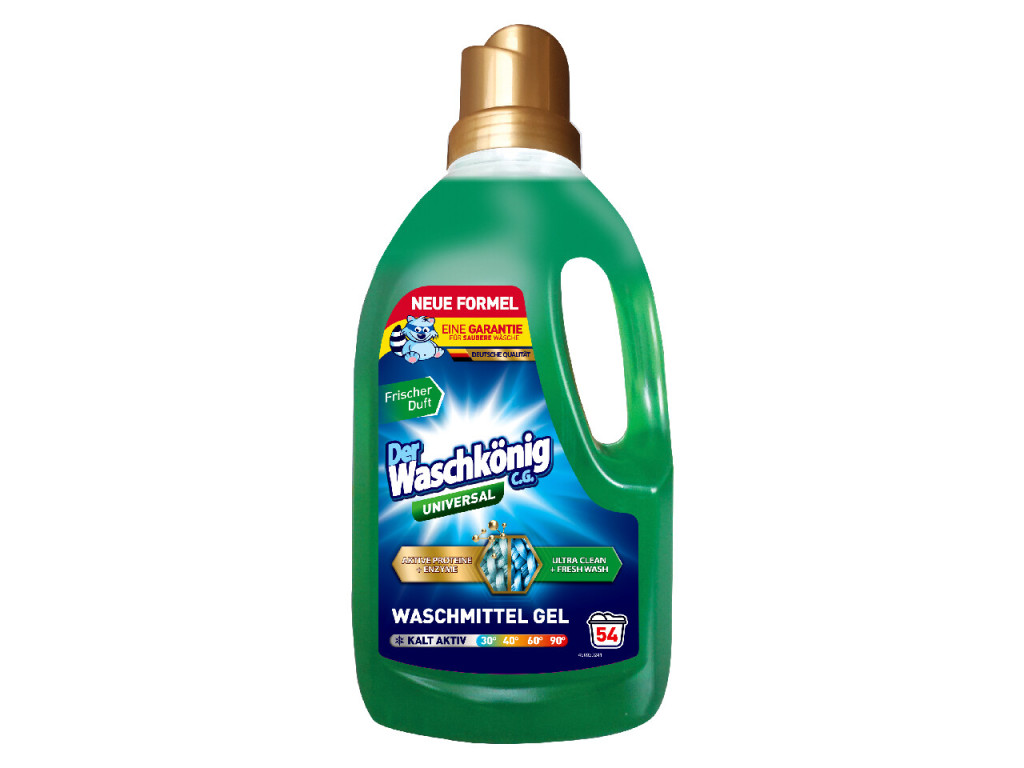 A Der Waschkönig Universal mosógél sokoldalú, erőteljes tisztítóhatást biztosít minden típusú textíliához. Formulája kíméletes a ruhákhoz, ugyanakkor hatékonyan távolítja el a makacs szennyeződéseket és a kellemetlen szagokat.