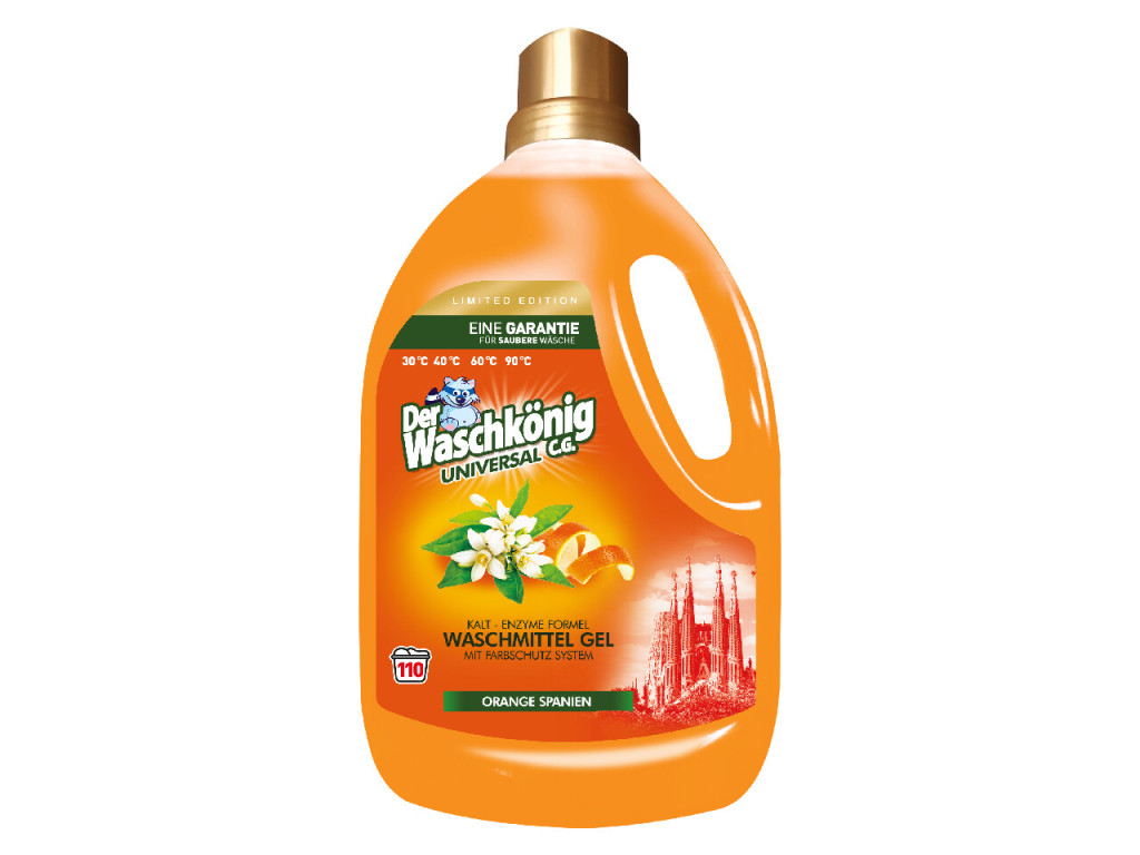 Der Waschkönig Orange Spanien tökéletes választás mindennapi mosáshoz – erőteljes tisztítóhatással, kellemes citrusos illattal és gazdaságos kiszereléssel.