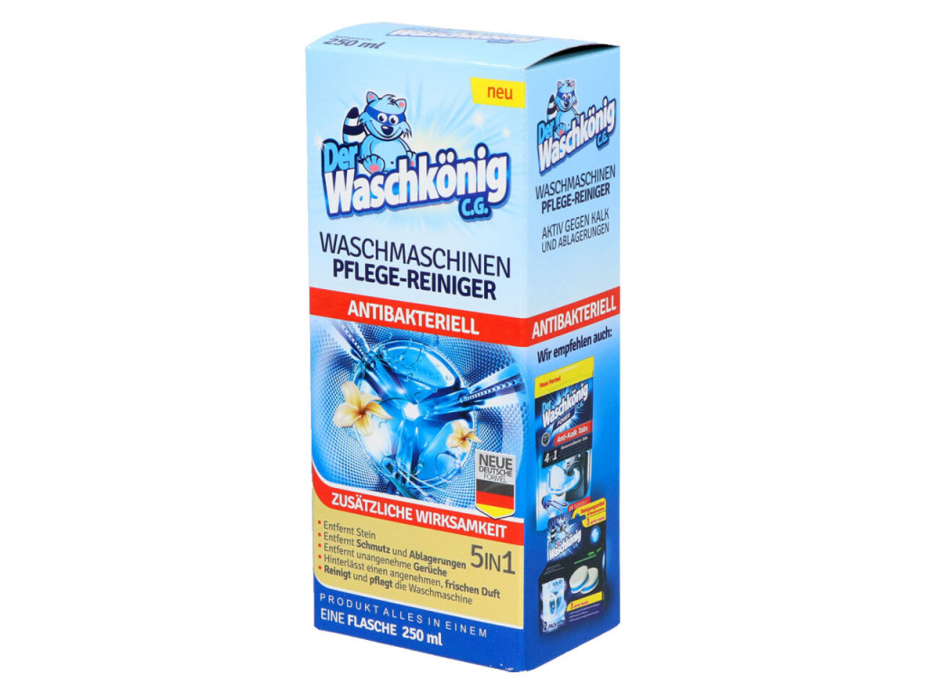 A Der Waschkönig mosógéptisztító folyadék hatékony, 5 az 1-ben formulával készült, amely segít megszabadítani a mosógépet a vízkőtől, a lerakódott szennyeződésektől és a kellemetlen szagoktól. Rendszeres használatával a készülék tisztább, frissebb és hosszabb élettartamú lesz.