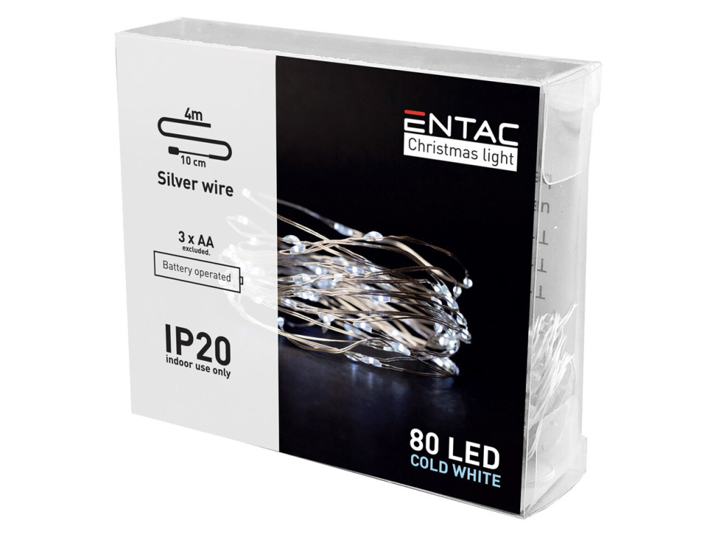 Entac Karácsonyi HIDEG fehér fényfüzér – Drótfüzér – 80 LED – 4 m – IP20 (Beltéri)