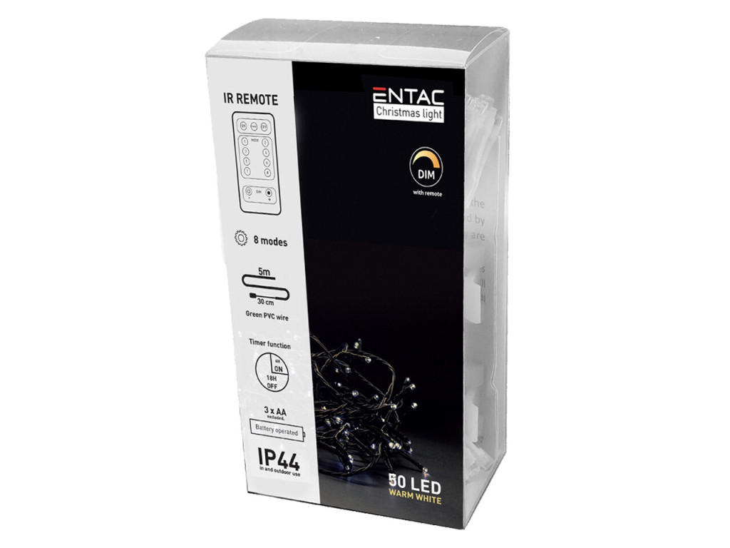 Entac Karácsonyi MELEG fehér fényfüzér időzítővel és távirányítóval – 50 LED – 5 m – IP44