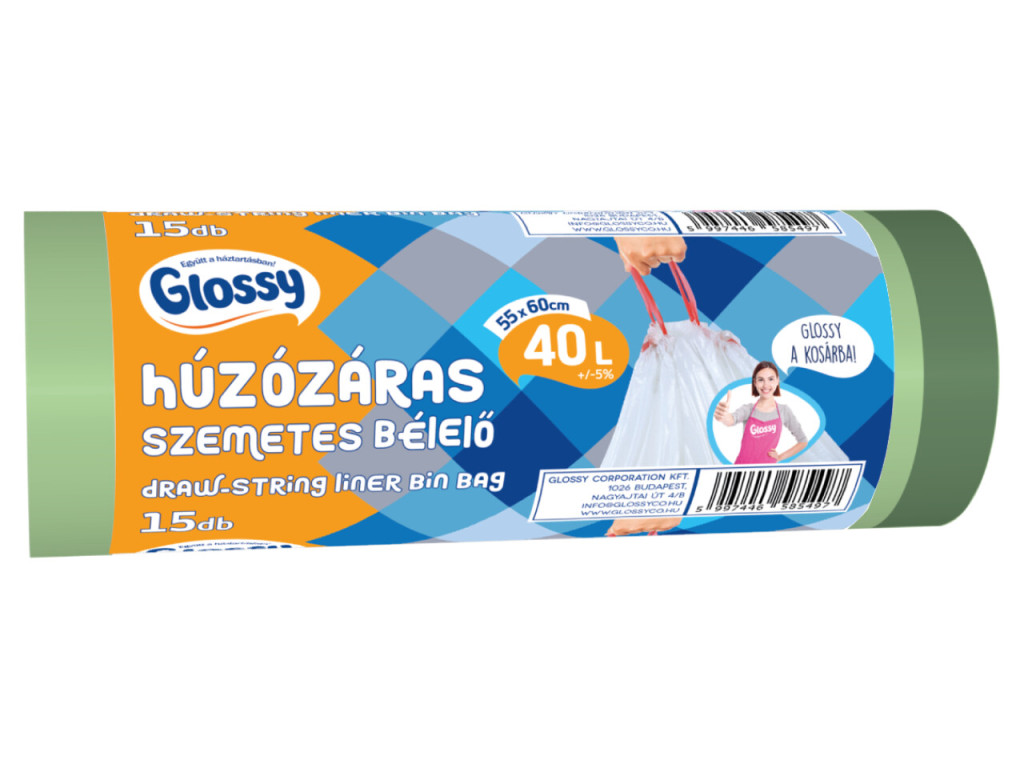 Glossy húzózáras szemeteszsák 40L / 15 db – praktikus, higiénikus és erős megoldás a mindennapi tisztaságért!