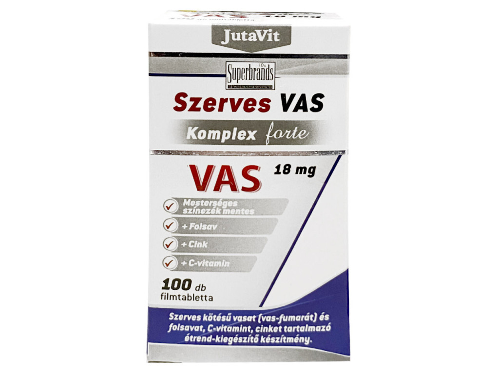 A JutaVit Szerves Vas Komplex Forte 18 mg szerves kötésű vasat (vas-fumarát), valamint folsavat, C-vitamint és cinket tartalmazó étrend-kiegészítő. A készítmény mesterséges színezék mentes, és kizárólag szerves vasformát tartalmaz, nem tartalmaz szervetlen vasvegyületeket (pl. vas-szulfát).