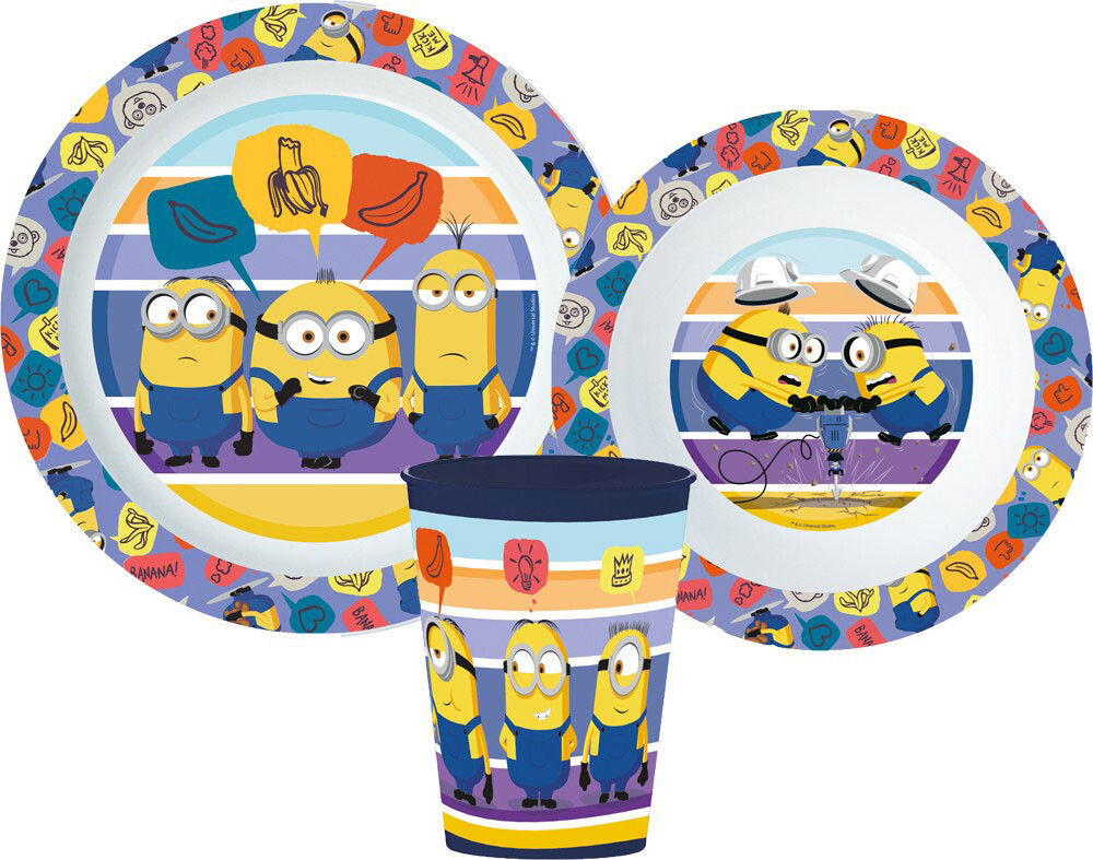 Minyonok Striped étkészlet, micro műanyag szett, pohárral 260 ml