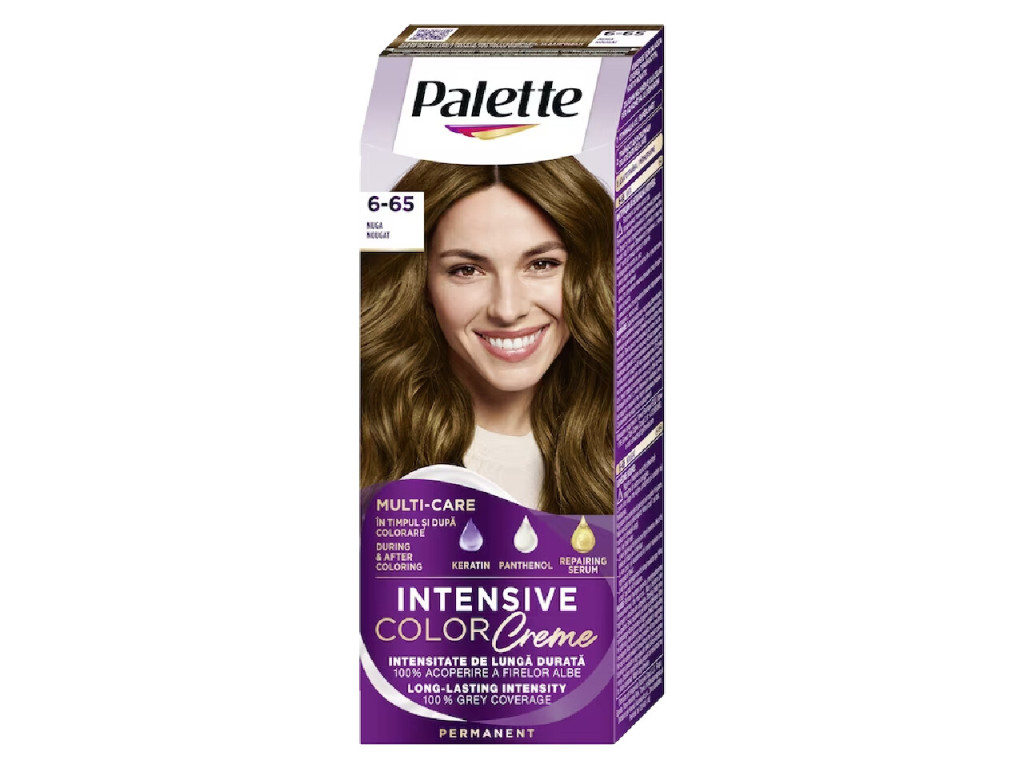 A Palette Intensive Color Creme 6-65 Mogyoróbarna hajfesték természetes, meleg barna árnyalatot biztosít, amely ragyogó és hosszan tartó színt eredményez. A Multi-Care ápoló formula keratinnal, panthenollal és ápoló szérummal gazdagított, amely segít megőrizni a haj puhaságát és egészséges fényét a festés során és után is.