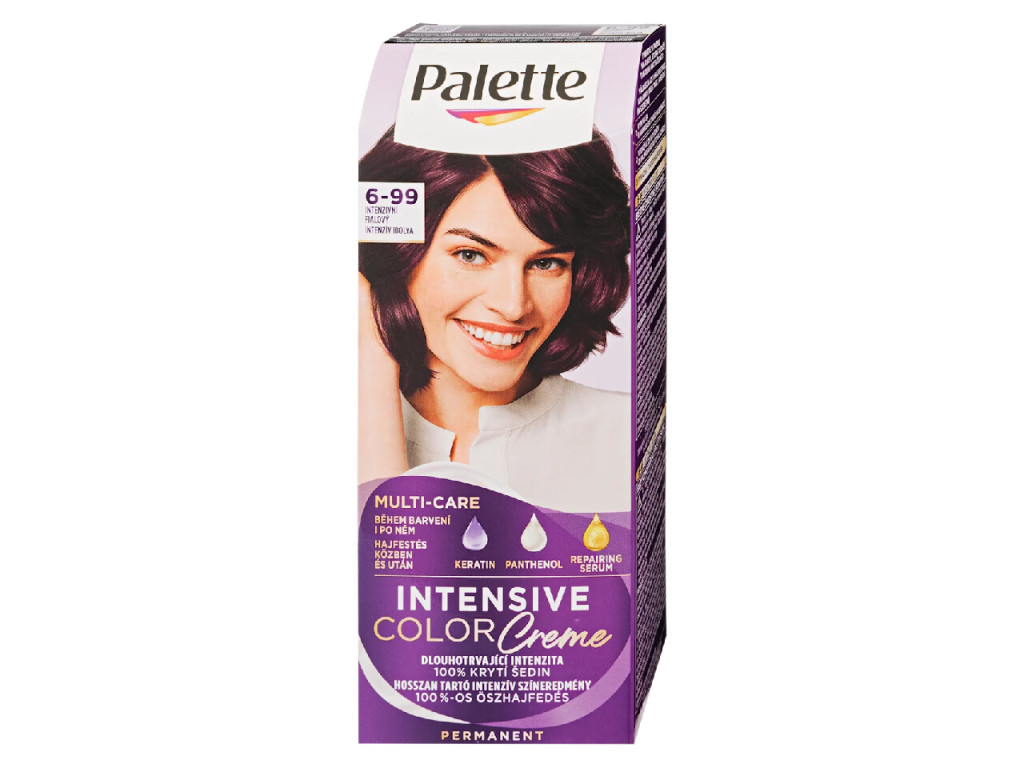 A Palette Intensive Color Creme 6-99 Intenzív ibolya hajfesték különleges, mély ibolyás árnyalatot biztosít, amely modern és feltűnő megjelenést kölcsönöz. A Multi-Care ápoló formula keratinnal, panthenollal és ápoló szérummal gazdagított, amely segít védeni és ápolni a hajat a festés során és után.