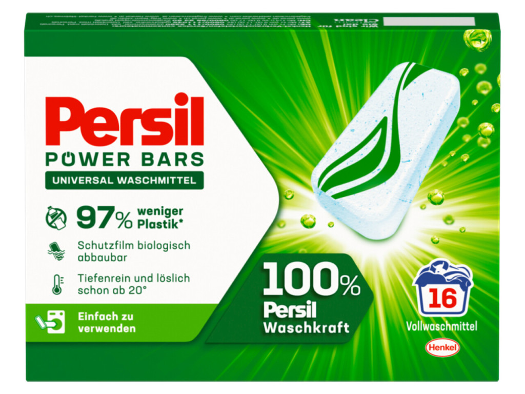 A Persil Power Bars Universal forradalmian új, szilárd mosókapszula formájú mosószer, amely a Persil 100%-os mosóerejét kínálja kevesebb környezeti terheléssel. Mélyen tisztítja a ruhákat már 20°C-on is, eltávolítja a makacs foltokat, és hosszan tartó frissességet biztosít minden mosás után.