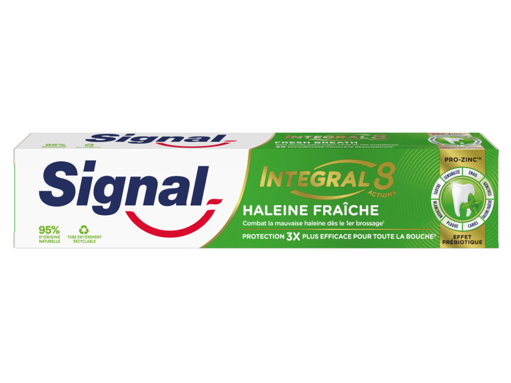 Signal Integral 8 Fresh Breath fogkrém hatékony megoldást nyújt a friss lehelet megőrzésére és a teljes szájüreg ápolására. Speciális formulája segít felvenni a harcot a kellemetlen leheletet okozó baktériumokkal szemben már az első fogmosástól kezdve. Az Integral 8 technológia 8 kulcsfontosságú területen biztosít védelmet, miközben kíméletes a fogzománchoz és az ínyhez.