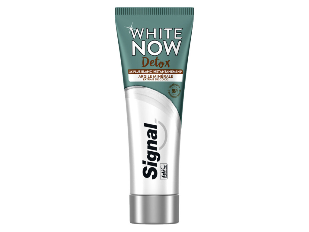 A Signal White Now Detox fogkrém ötvözi az azonnali fehérítő hatást és a természet ihlette tisztító formulát. Az ásványi agyag és kókusz kivonat tartalmának köszönhetően segít eltávolítani a szennyeződéseket, miközben ragyogóbb, tisztább mosolyt biztosít.