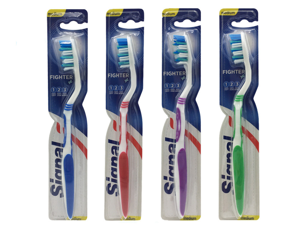Signal Fighter+ fogkefe hatékony segítséget nyújt a mindennapi szájápolásban. Medium keménységű sörtéi alaposan tisztítják a fogakat és a nehezen elérhető területeket is, miközben kíméletesek az ínyhez. Ergonomikus kialakítású nyelének köszönhetően kényelmes fogást és biztos irányítást biztosít fogmosás közben. A termék több színváltozatban elérhető, a szín véletlenszerűen kerül kiválasztásra.