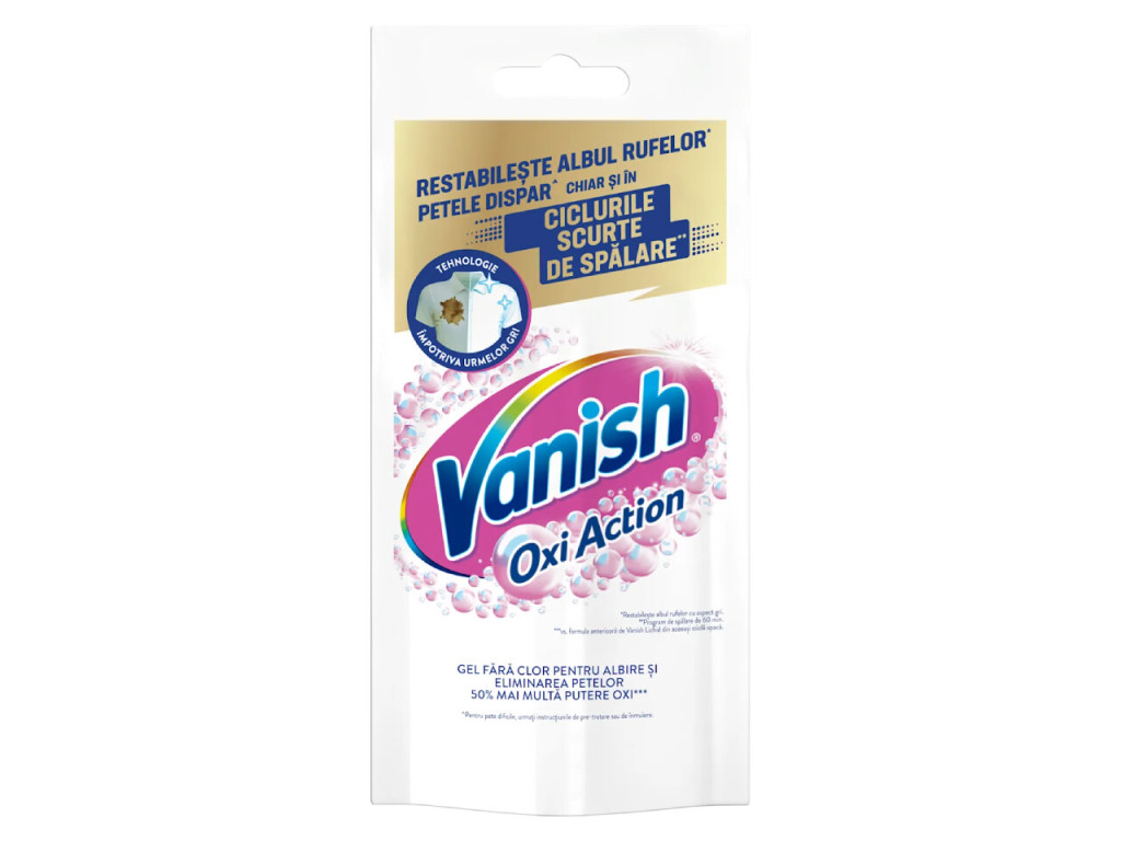 A Vanish Oxi Action folteltávolító gél kifejezetten fehér ruhákhoz lett kifejlesztve, hogy visszaállítsa a textíliák ragyogó fehérségét és hatékonyan eltávolítsa a makacs foltokat már rövid mosási ciklusok során is.