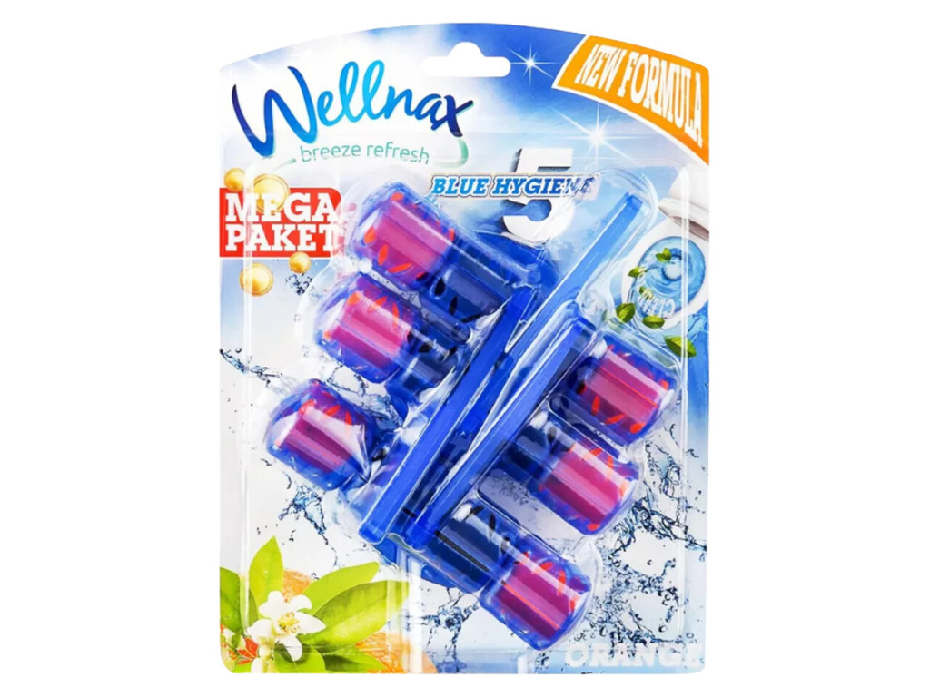 Élénkítő tisztaság és frissesség minden öblítéskor! A Wellnax Breeze Refresh Blue Hygiene WC frissítő – Narancs a mindennapi higiénia praktikus és hatékony eszköze, mely 5 az 1-ben hatással gondoskodik a WC-csésze tisztaságáról, friss illatáról és vízkő elleni védelméről. Minden lehúzáskor élénk narancsillat és kék víz jelzi a hatását.